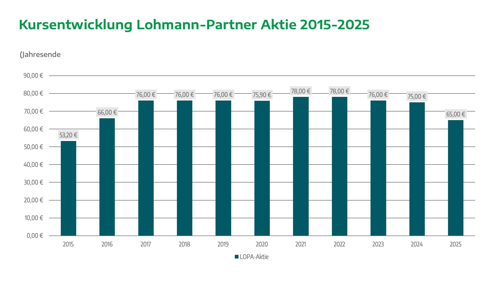 Der Kurs der Lohmann-Partner Aktie ist von € 53,20 in 2015 bis auf € 78,00 in 2021/2022 gestiegen. Danach ist der Kurs gefallen bis auf € 65,00 in 2025. Die Kurse der Lohmann-Partner Aktie werden unter Berücksichtigung des in 2015 vorgenommenen Aktiensplits 1:5 dargestellt.