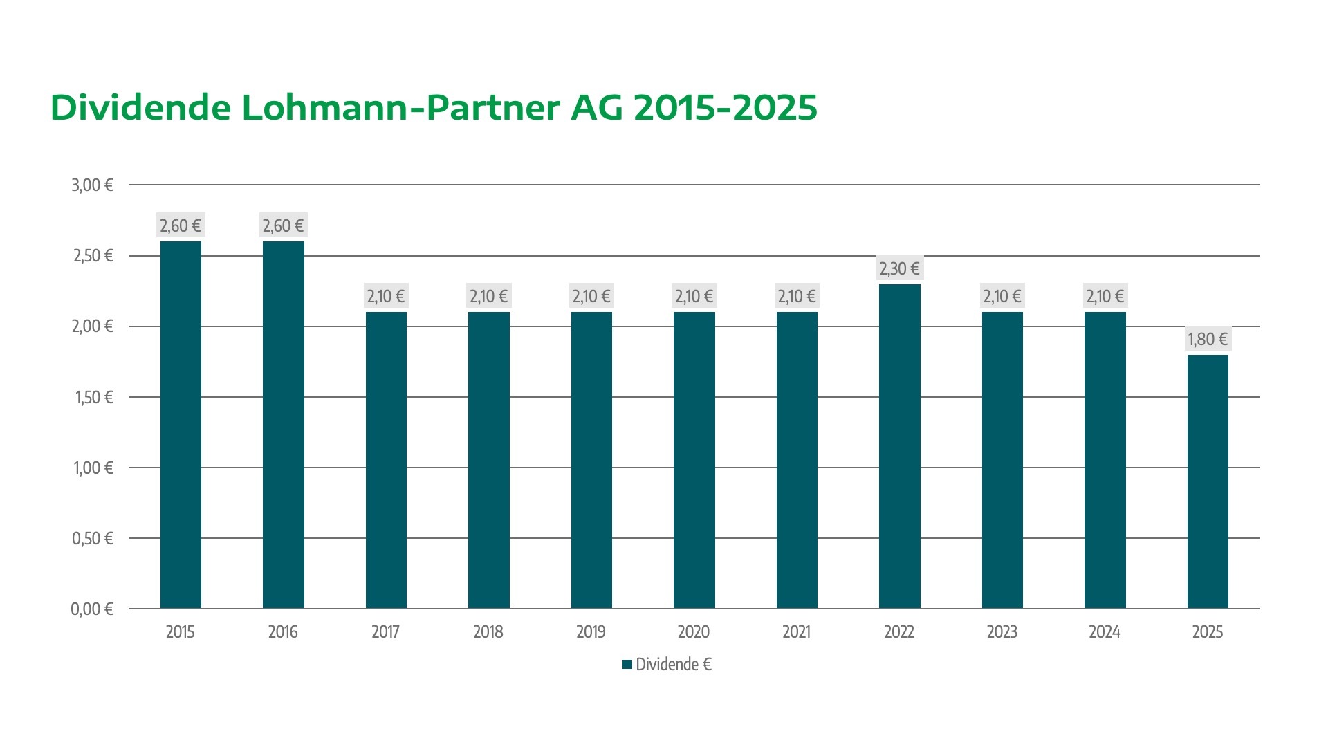 Im Durchschnitt der letzten 11 Jahre (2015 – 2025) betrug die Dividende € 2,18 pro Aktie.