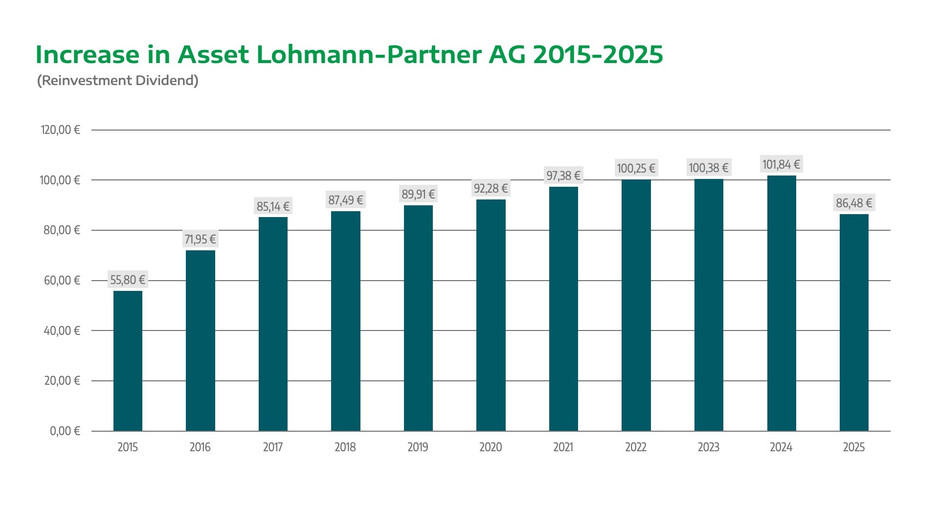 A share with a value of €53.20 in 2015 would have generated assets of €86.48 by 2025 through the annual reinvestment of dividends in new shares at the current price.